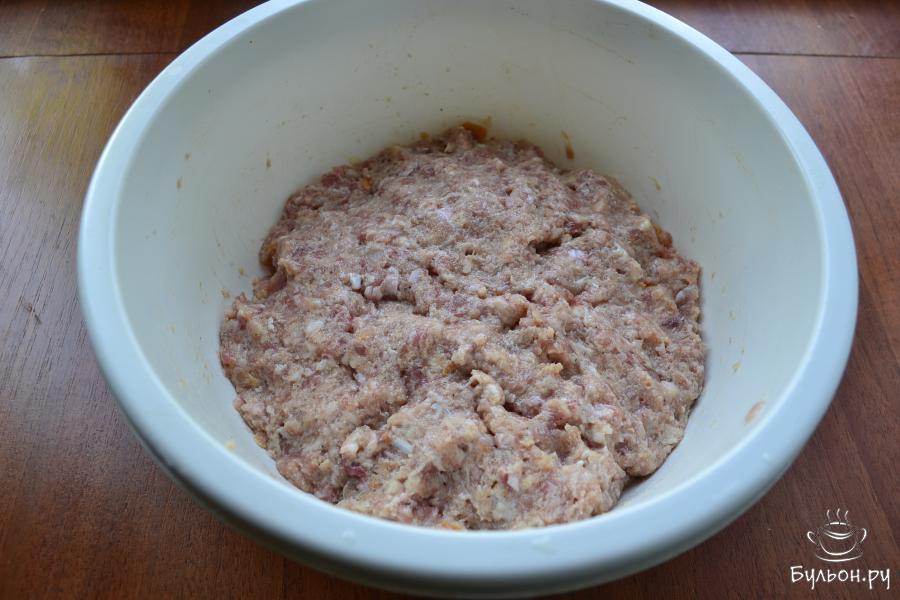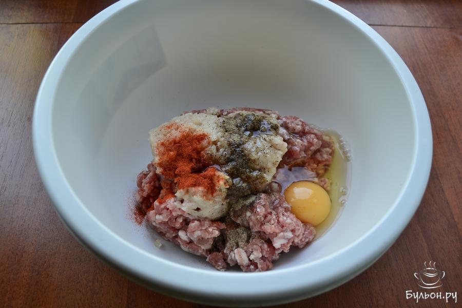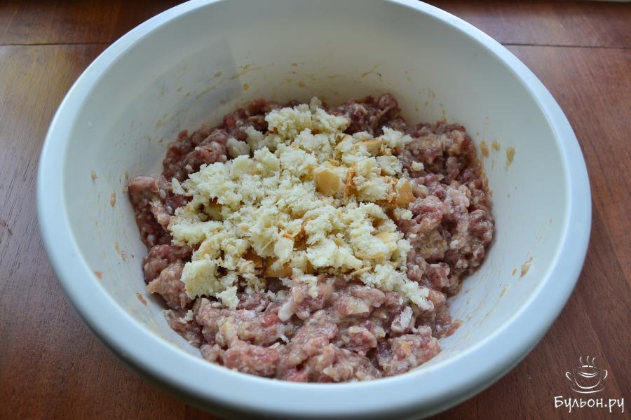 4. Все хорошо вымешать, добавить отжатый хлеб, размоченный в воде или молоке. Корочки с хлеба можете обрезать, я этого не делаю.