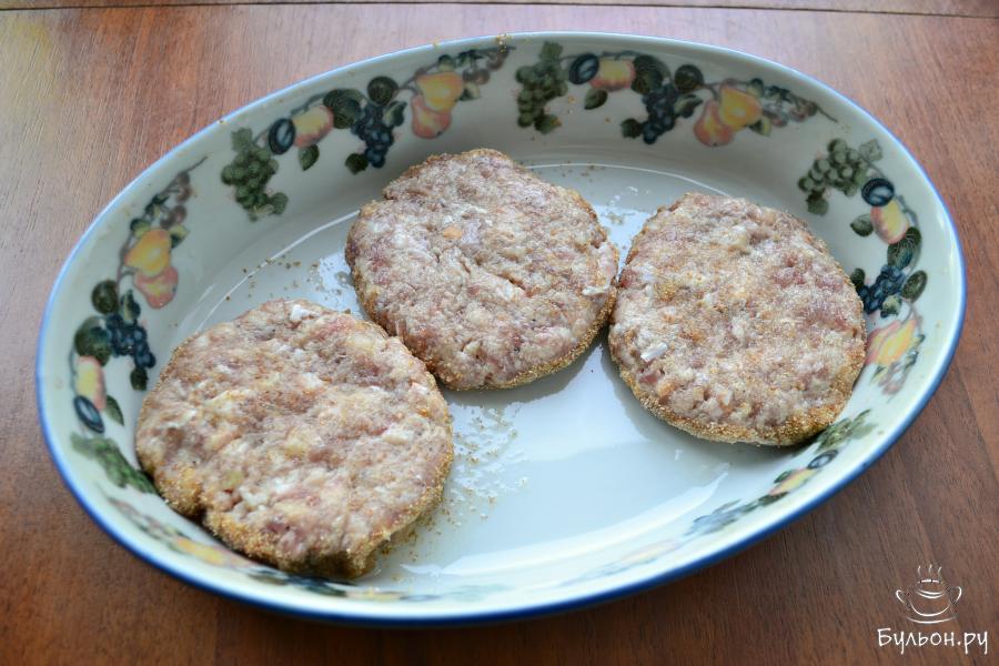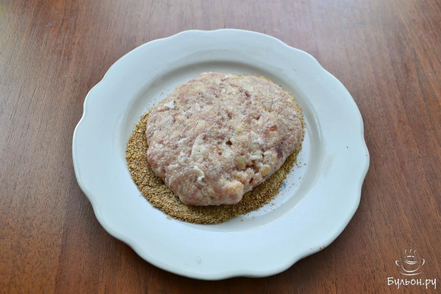 6. Сформировать довольно крупные котлеты, у меня получилось 3 шт, одну сторону, нижнюю, запанировать в сухарях.