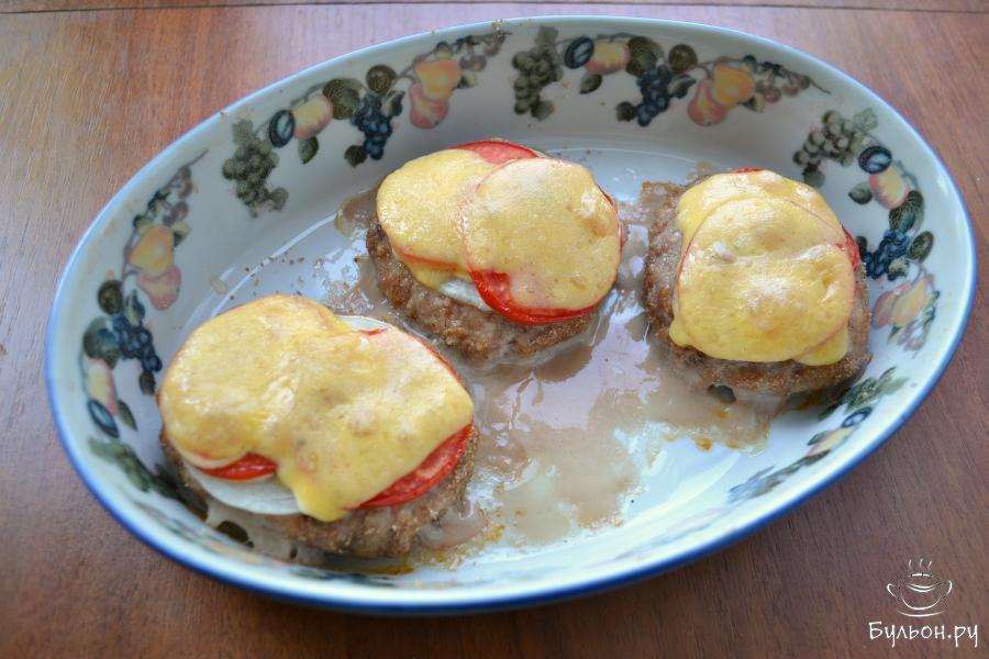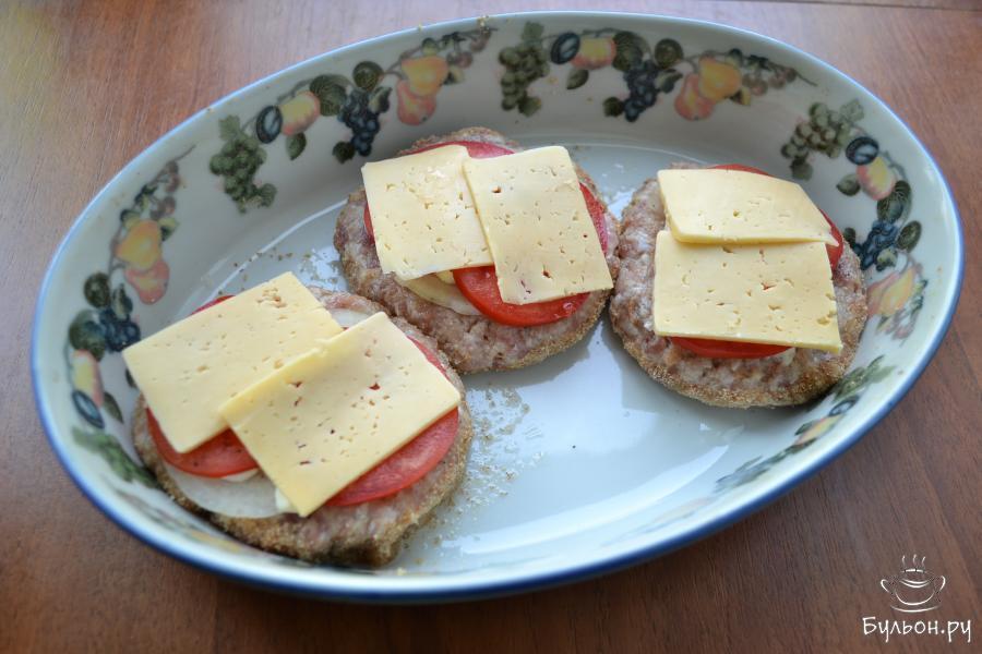 9. Далее выложить на котлеты по 2 тонких кружочка свежего помидора, чуть посолить и посыпать молотым перцем.
