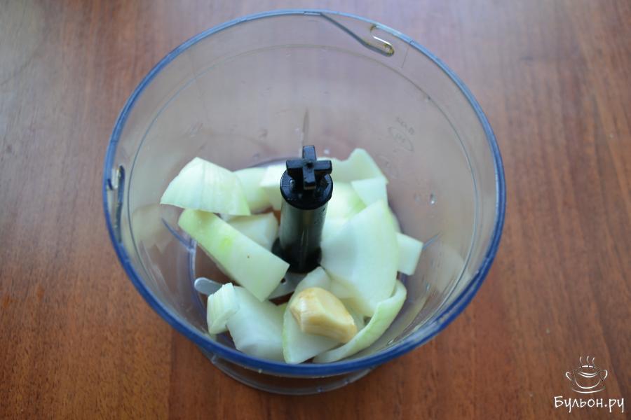 1. Одну целую луковицу очистить, порезать и поместить в чашу блендера вместе с зубочком очищенного чеснока.