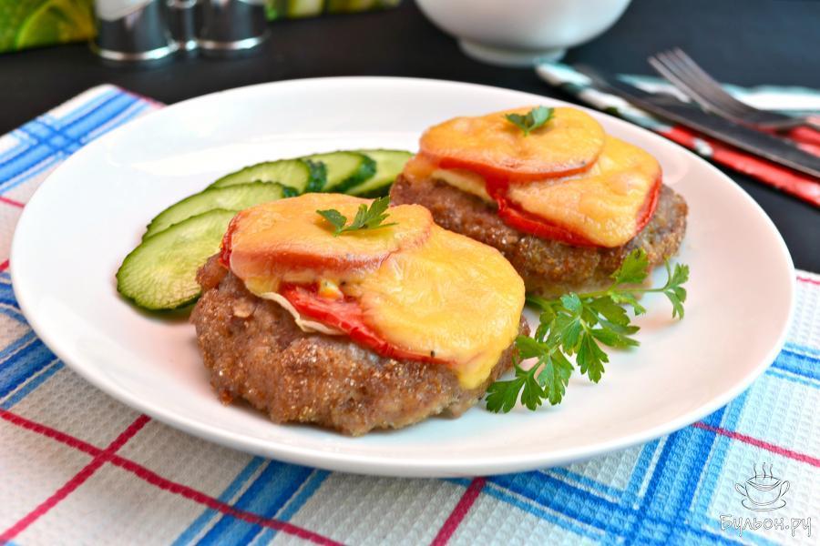 Мясные котлеты по-французски, приготовленные в духовке получаются не просто вкусными, а необычайно вкусными. Благодаря панировке в сухарях, котлеты сохраняют мясной сок, отчего приобретают невероятную сочность. А шапочка из помидоров, майонеза и сыра придает ощущение необыкновенной нежности этому блюду. Такие котлеты совершенно просто приготовить в домашних условиях. Подать котлеты лучше всего с картофельным пюре, рассыпчатыми кашами или овощным гарниром. Попробуйте, котлеты действительно заслуживают вашего внимания.