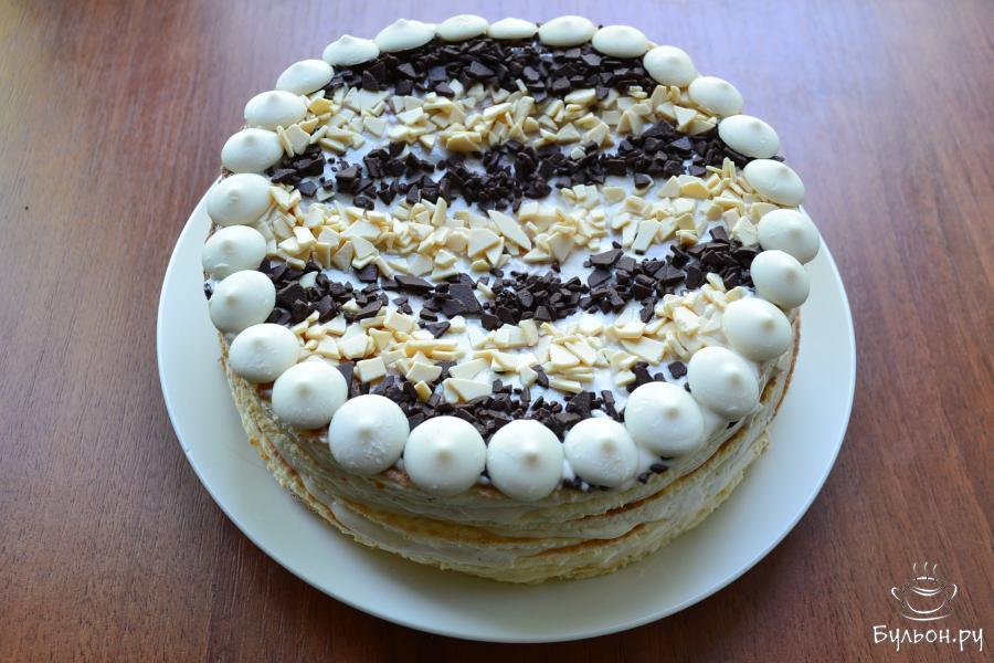 11. Тортик Сметанник, приготовленный без духовки украсить на свое усмотрение. Я украсила осколками и каплями белого и черного шоколада. Поместить торт в холодильник, как минимум на 3 часа.
