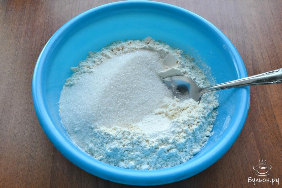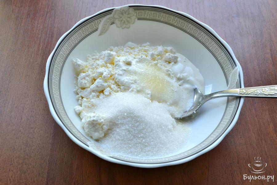 4. В жирный и мягкий домашний творог добавить 200 гр. Сметаны, всыпать 200 гр. Обычного сахара и сахар ванильный.