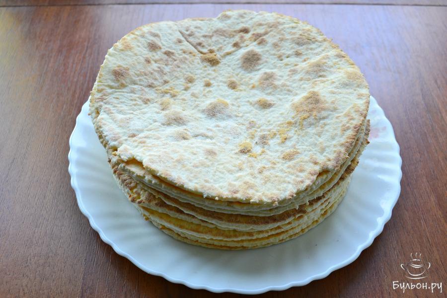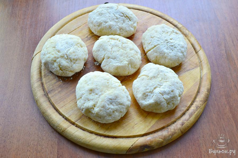 7. Каждый шарик теста раскатать довольно тонко, подпыляя стол мукой. Края лепешки ровно обрезать, разместив сверху круглую тарелку или крышку. Обрезки также, использовать. У меня получилось в итоге 9 лепешек.