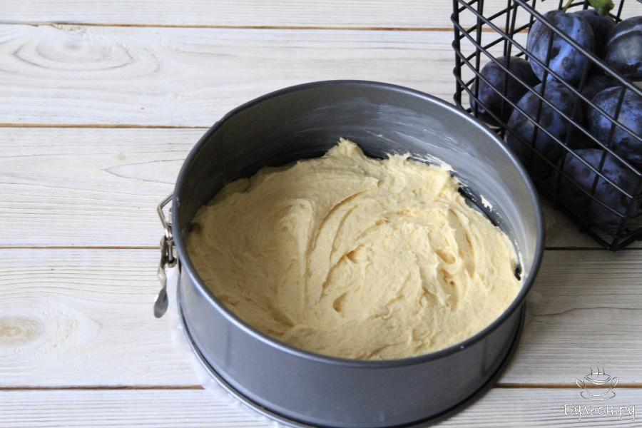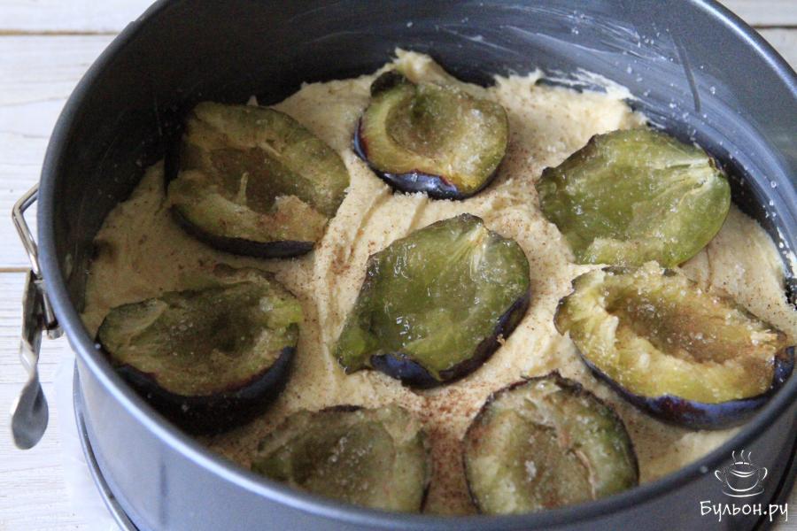 7. Разложить половинки сливы, слегка их утопив в тесто. Затем присыпать тростниковым сахаром и корицей Выпекать пирог 45-50 минут при 170 градусах. Готовность проверить зубочисткой.