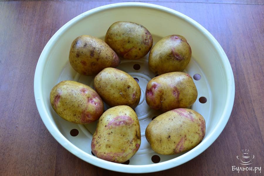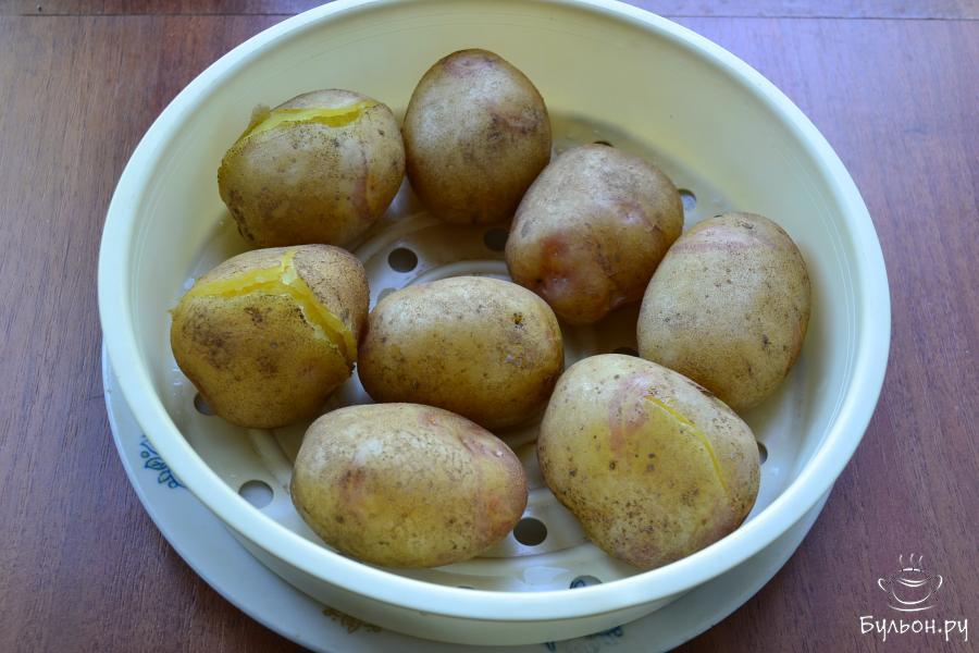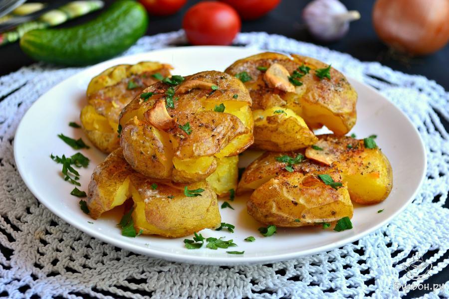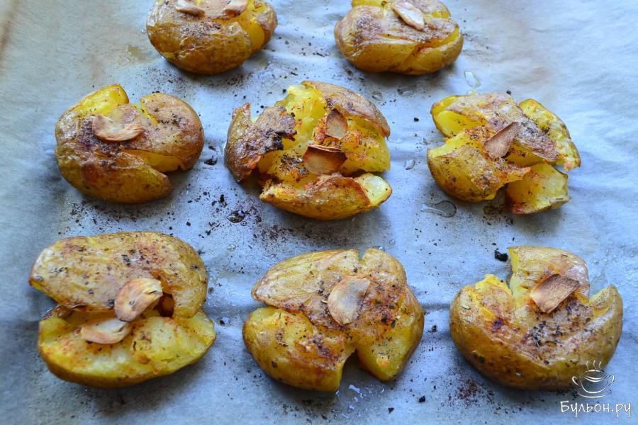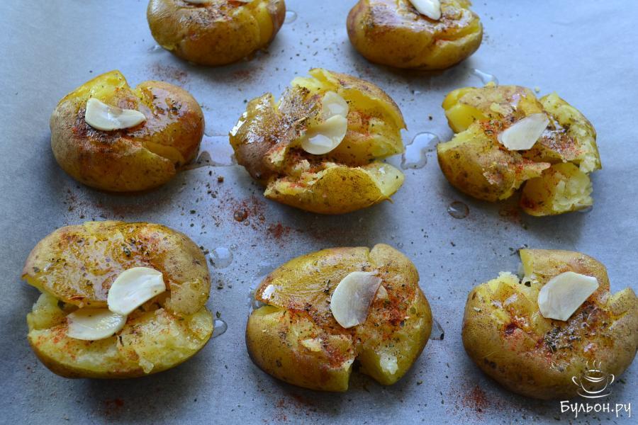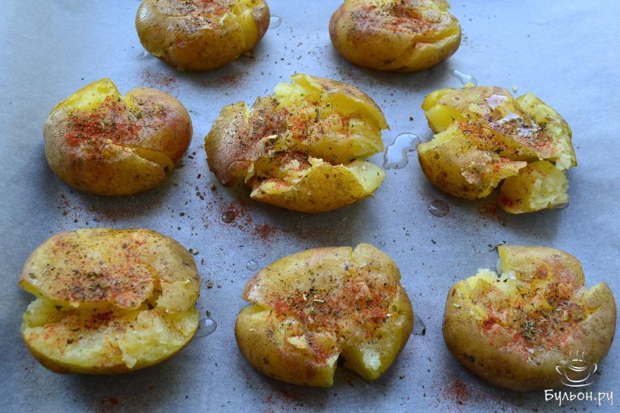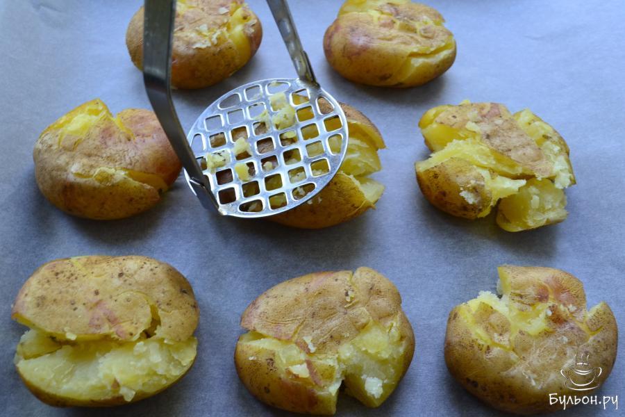 3. Противень или форму застелить пергаментом, выложить горячий картофель, немного придавить толкушкой, чтобы каждая картофелина лопнула.