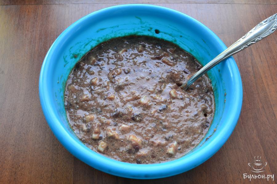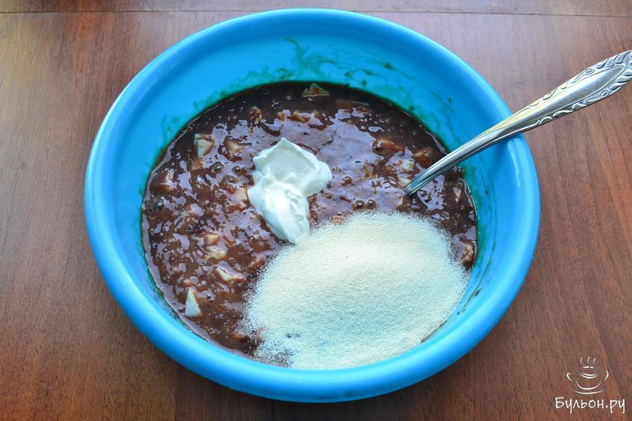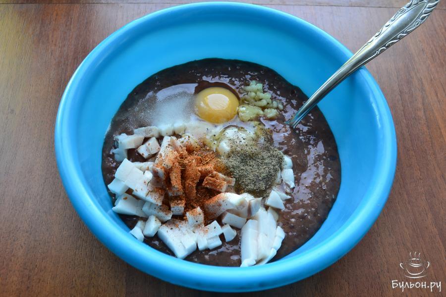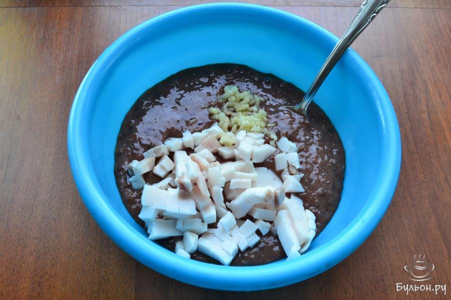 3. Печеночную массу выложить в миску, добавить измельченный чеснок и порезанное маленькими кусочками свиное сало.