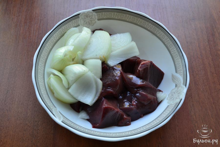 1. Свиную печень хорошо помыть, замочить в холодной воде на 1 час. Порезать печенку кусочками вместе с репчатым луком.