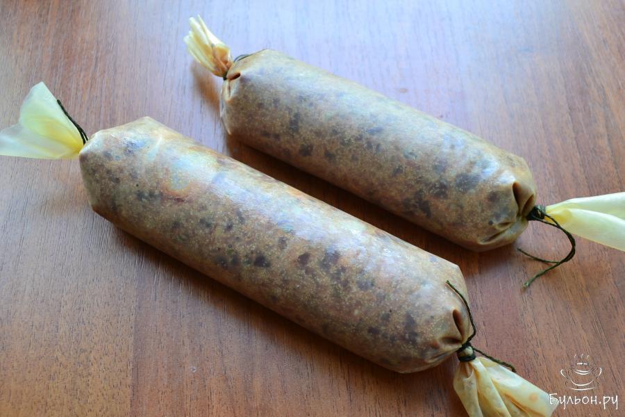 8. А затем наполнить мягкую оболочку подготовленным печеночным фаршем, крепко перевязав концы. Слишком плотно наполнять оболочку фаршем нельзя.