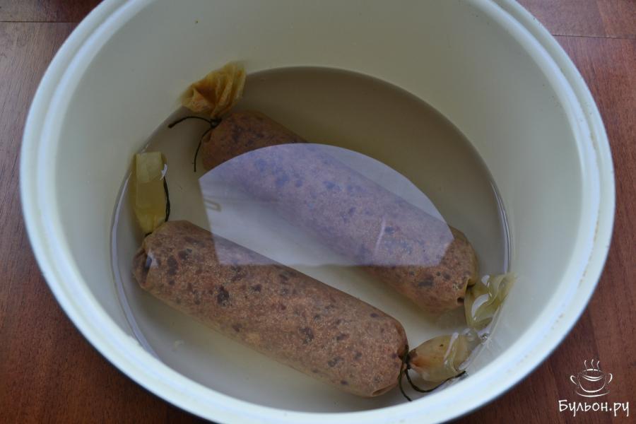 9. Колбасу разместить в чаше или обычной кастрюле, залить охлажденной водой. Если варить в мультиварке, нужна функция Мультиповар, температура - 80 град, время варки - 2 часа. В кастрюле - не доводя воду до кипения, томить в горячей воде то же время.