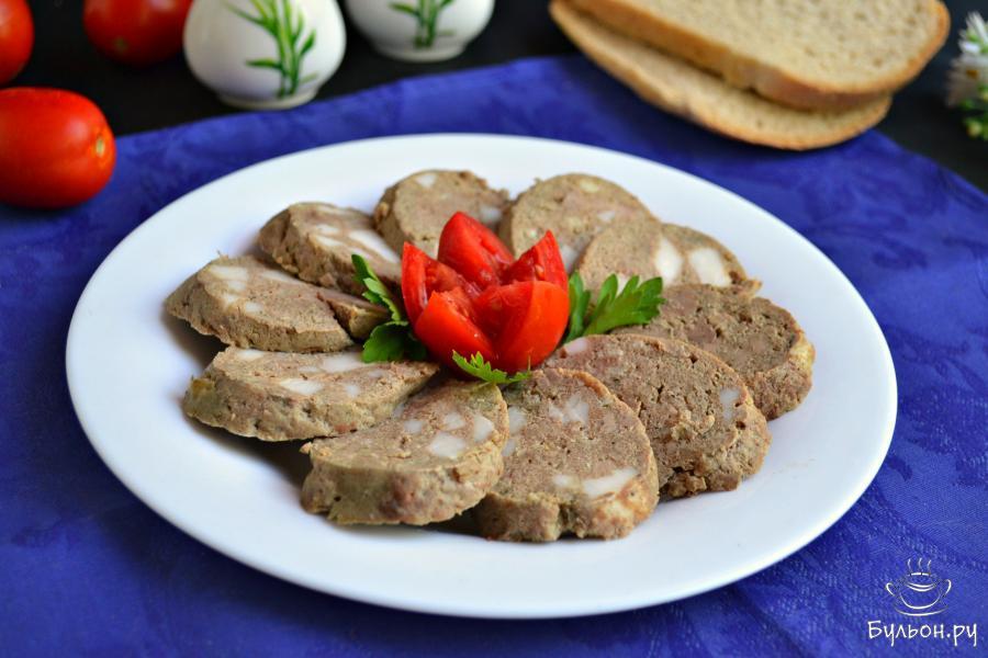 10. Готовую печеночную колбасу охладить в прохладной воде минут 10, затем остудить при комнатной температуре, отправить в холодное место на 3-4 часа. Далее, очень вкусную печеночную колбасу порезать и можно подавать. Приятного аппетита.