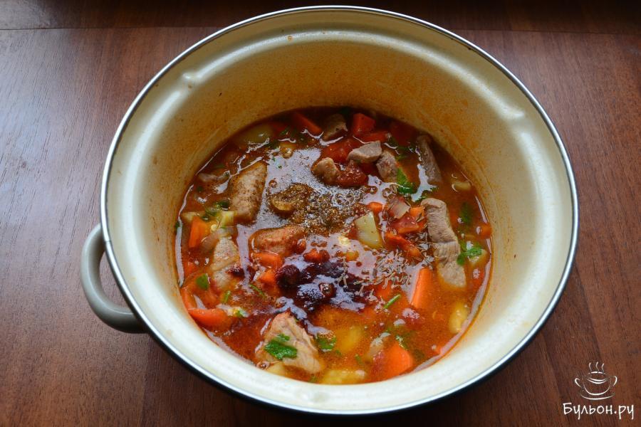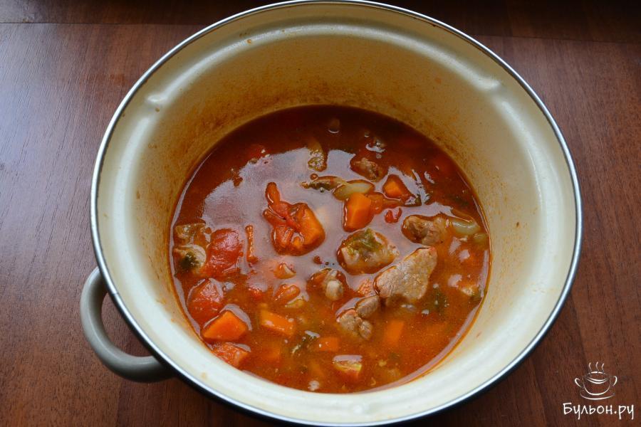 8. Всыпать паприку, зиру, кориандр, если нужно, добавить воды и поставить тушить мясо еще на 20 минут.