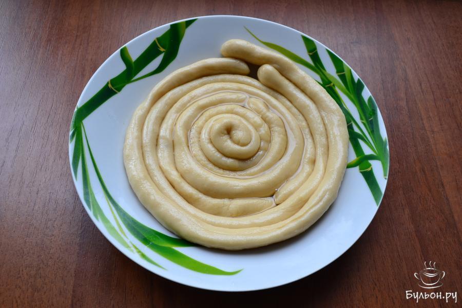 14. Далее, каждый жгут раскатать или скрутить в тонкие жгутики, толщиной с карандаш, также, их смазать маслом и выложить спиралью на тарелку. Прикрыть тесто и снова оставить на 15 минут.