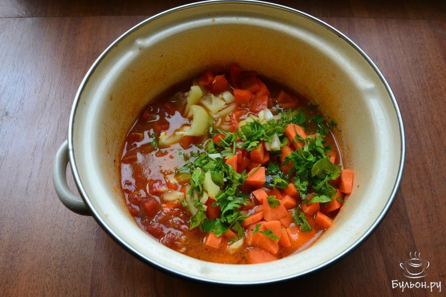 7. Тушить свинину на медленном огне 25 минут, после чего добавить морковь, зелень, перец болгарский и чеснок.
