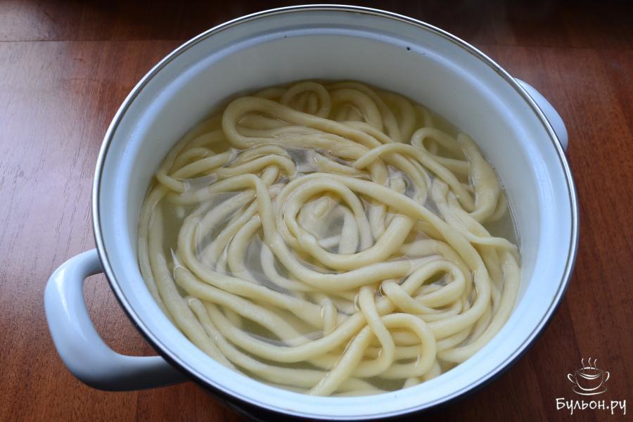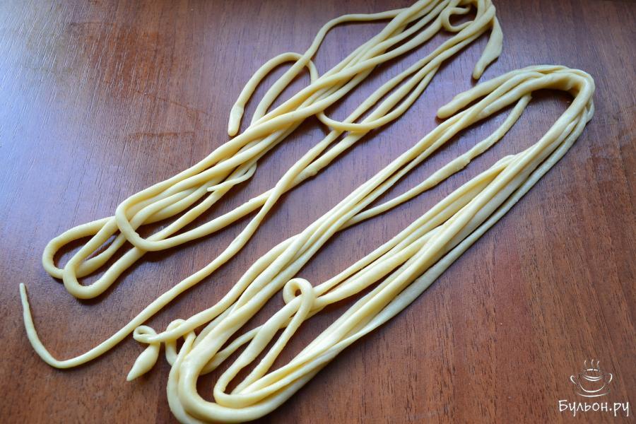 15. Затем каждый жгутик нужно вытянуть в тонкую лапшу. Тесто очень податливое, не рвется, работать с ним легко.