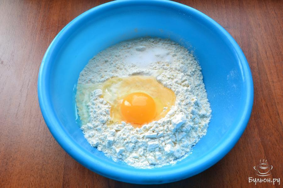10. Пока будет тушиться и настаиваться мясо с овощами, нужно приготовить лапшу. Можно, конечно, готовить лагман и с покупной лапшой, но домашняя намного лучше. К муке добавить щепотку соли и сырое яйцо.