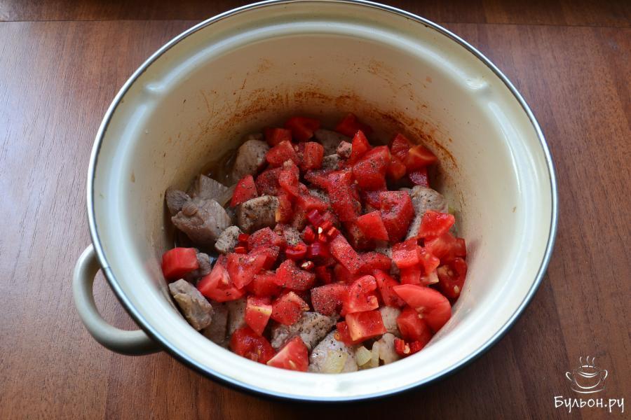 5. Далее добавить к мясу помидоры, порезанный перец чили, все поперчить, немного обжарить все вместе.