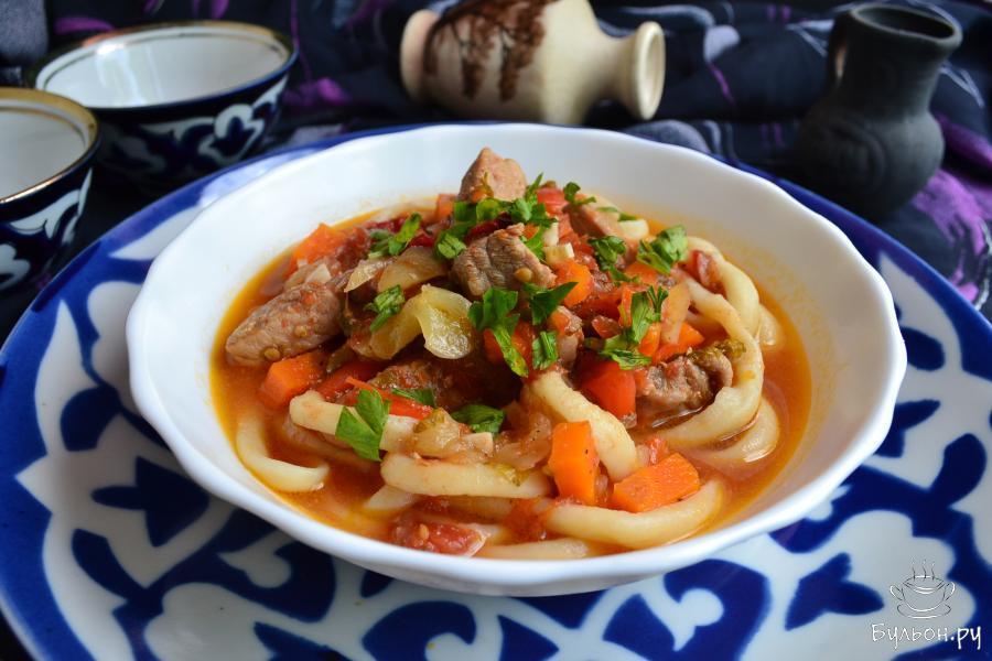 Лагман - национальное, очень популярное среди азиатских народов блюдо, которое готовят из мяса, с добавлением овощей и вытянутой самодельной лапши. Конечно же, лагман готовят из баранины, но я предлагаю попробовать блюдо со свининой по-узбекски, которое получается не менее вкусным. Лапшу для лагмана готовят особым способом, выдерживая, а затем вытягивая подготовленное тесто. Блюдо изумительное: вкусное, насыщенное, очень сытное и ароматное. Лагман можно предложить и, как первое, и, как второе, называемое "сухим лагманом" блюдо. В первом варианте лапша заливается большим количеством соуса с мясом, в другом - лапшу подают просто с мясом, жидкости много не вливают. В любом случае, лагман - это нереально вкусно, попробуйте.