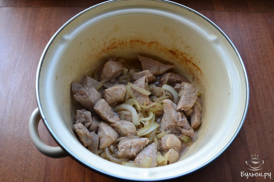 4. В чугунок или толстостенную кастрюлю влить 3 ст. л. растительного масла, разогреть. Выложить в масло мясо, немного обжарить, добавить лук, обжаривать до румяности.