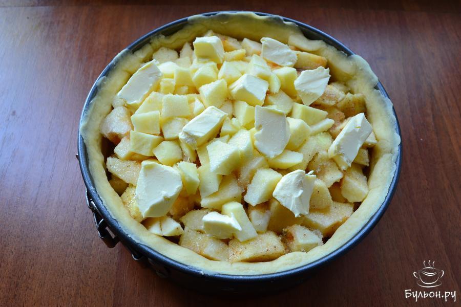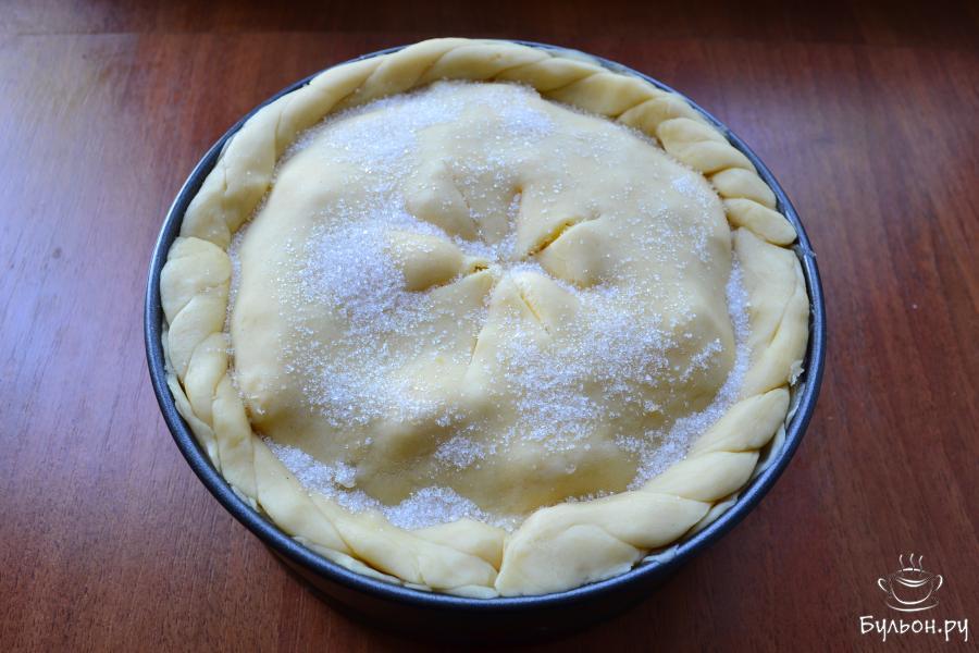 10. Оставшуюся часть песочного теста раскатать, выложить его на яблоки, закрывая пирог и защипывая края. Можно из теста сформировать жгут и пустить его по краю. В середине пирога обязательно сделать надрезы для выхода пара. Посыпать пирог немного сахаром - это по-желанию.