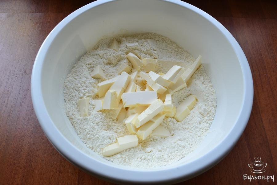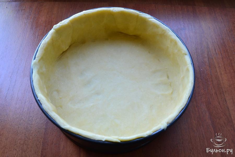 6. Раскатать одну часть теста и выложить ее в круглую, желательно разъемную форму д.22 см, формируя бортики до самого верха формы. Края теста обрезать.