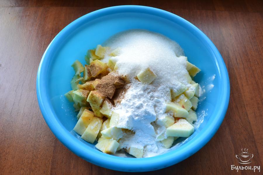 7. Яблоки очистить и удалить семена, порезать кубиками или дольками, сбрызнуть соком лимона. Всыпать оставшийся сахар, корицу и крахмал, перемешать.