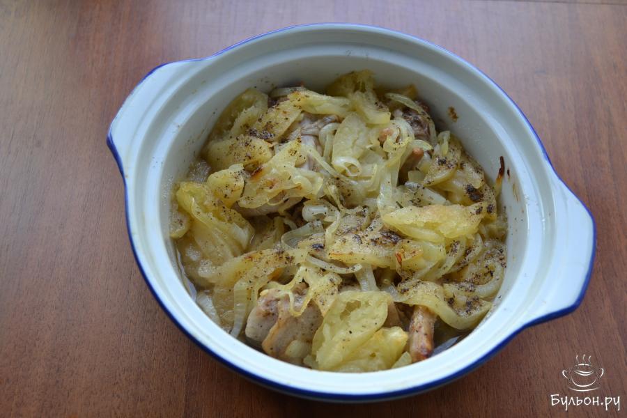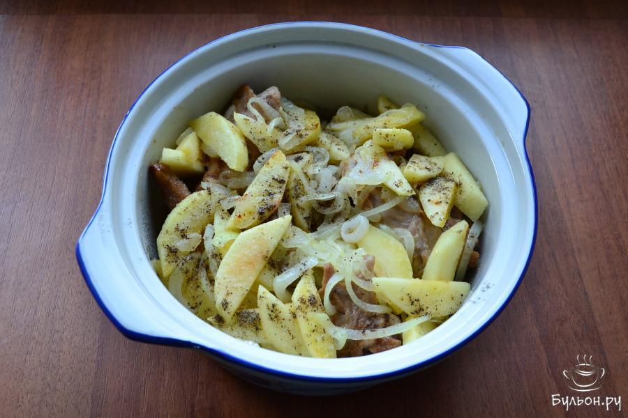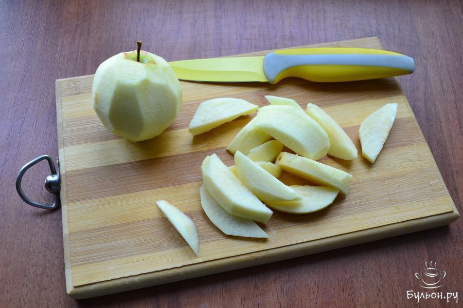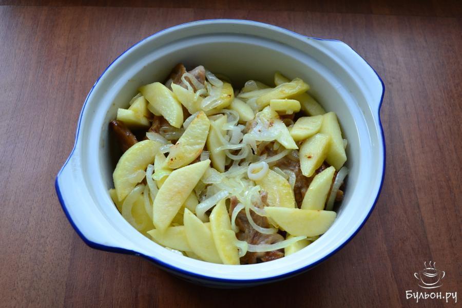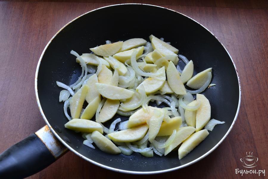 4. Обжарить яблоки на оставшемся растительном масле вместе с порезанным тонкими полукольцами луком и чуть посолив. Обжаривать нужно минуты 3-4, аккуратно перемешивая, чтобы яблоки не потеряли своей формы.