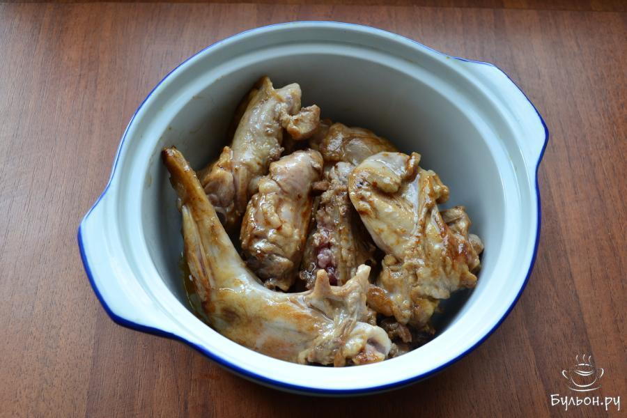 2. Обжарить мясо на растительном масле - 20 г, добавив в сковороду соевый соус, обжаривать до румяности с двух сторон. Выложить крольчатину в жаростойкую глубокую форму или кастрюльку.