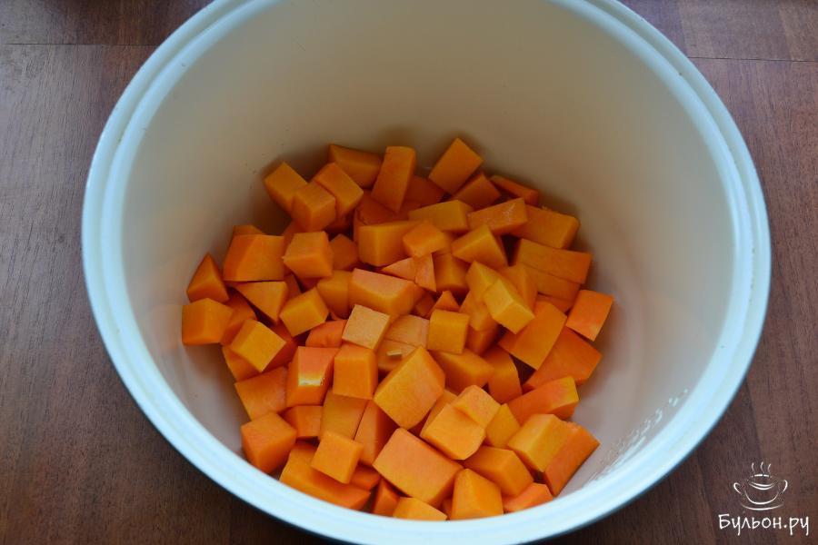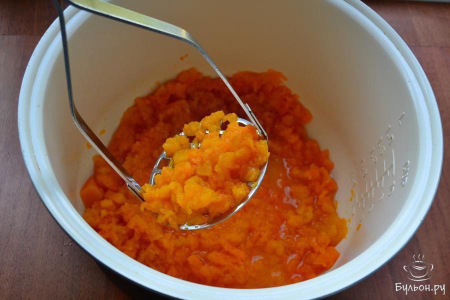 2. Влить 150 мл воды и готовить тыкву на функции "тушение" 20 мин. Далее тыкву размять немного толкушкой.