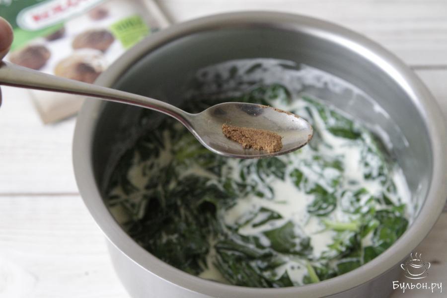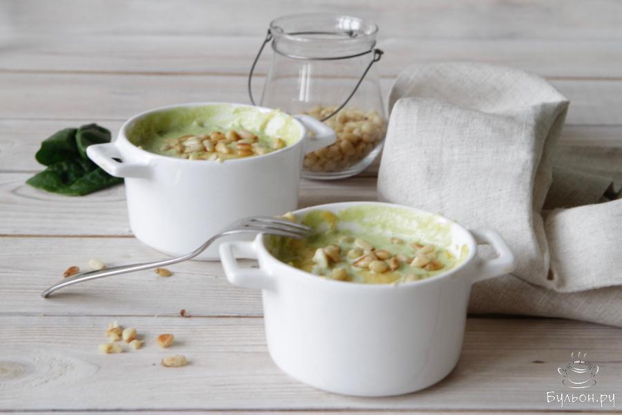 Сливочный шпинат с запеченным сыром отличный вариант вкусного завтрака. Но кроме того его можно приготовить на гарнир к рыбе или куриному филе. Готовят и подают шпинат в порционных формах и в теплом виде. Нежные листочки шпината пропитаны сливочным вкусом отлично сочетаются с кусочком белого тоста. Мускатный орех придает блюду особую пикантность, добавлять его нужно по вкусу, но главное не переборщить. Кедровые орехи предварительно обжаривают на сухой сковороде до золотистого цвета.