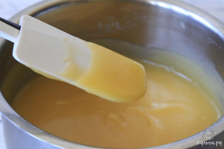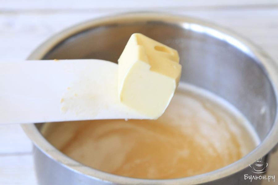 4. Далее процедить смесь, вылить в сотейник и довести до кипения. Затем добавить 35 гр сливочного масла.