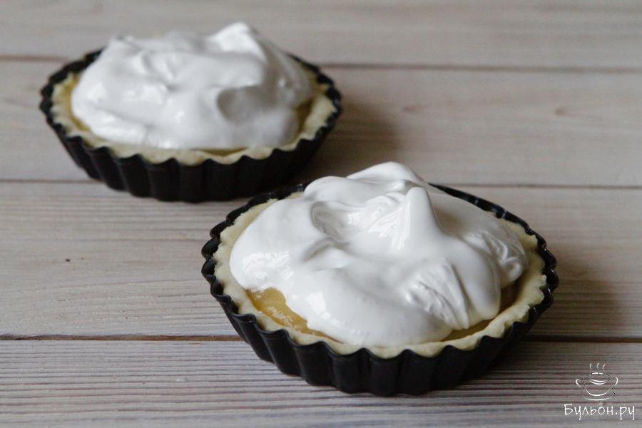 12. Белок одного яйца взбить с остатками сахара до густых пиков. И выложить сверху на лимонный курд. Формы отправить в духовку и запекать до подрумянивания меренги.