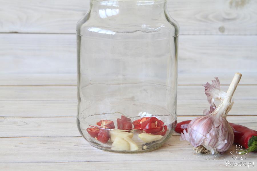 4. На дно трех литровой банки уложить зубчики чеснока, черный перец горошком и несколько долек перца чили, предварительно его порезав.