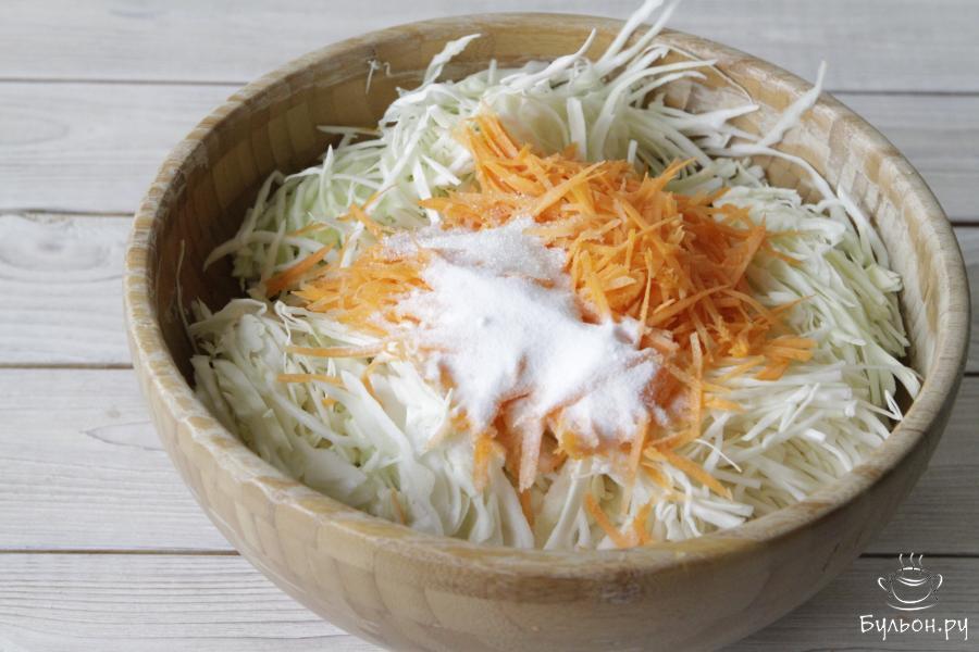 3. Капусту соединить с морковью, всыпать сахарный песок, посолить ( в рецепте указано приблизительное количество соли). Перетереть капусту с морковью и специями, слегка пожамкать и оставить на столе на 15-20 минут до появления сока.