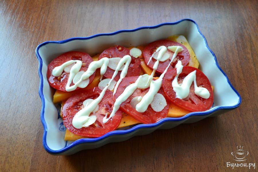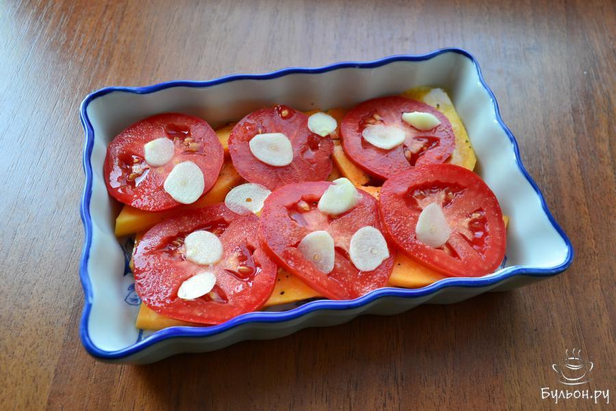 3. На тыкву разместить кружочки свежего помидора, на них - тонкие пластинки чеснока, помидоры чуть посолить.