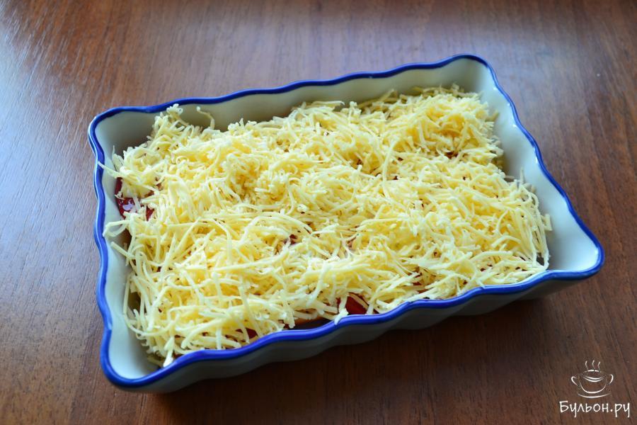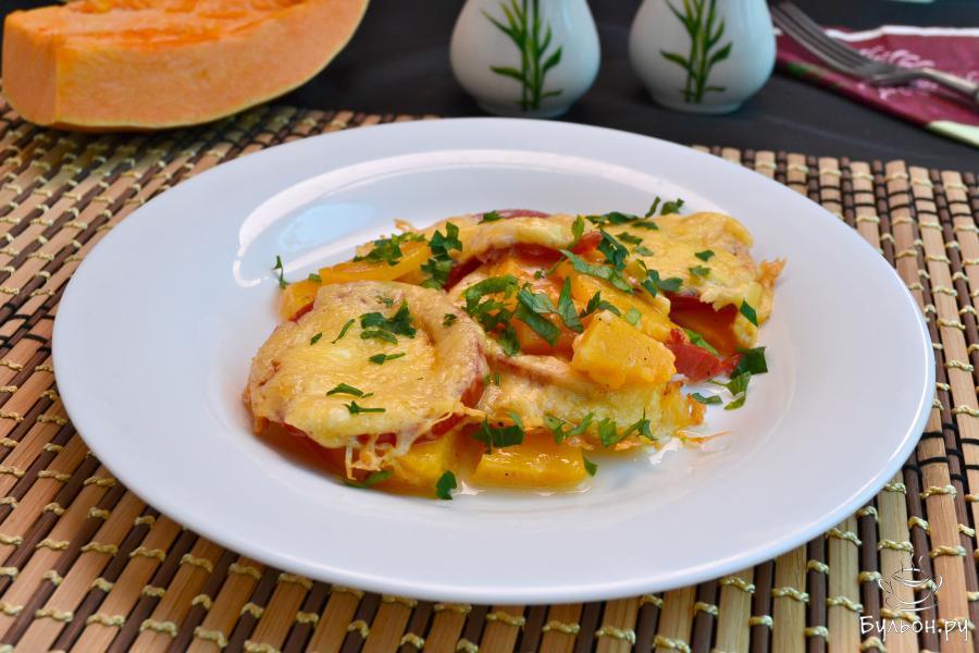6. Поместить все в духовку, разогретую до 200 гр. Запекать блюдо около 20-25 минут. Тыква останется чуть хрустящей, сыр полностью расплавится.