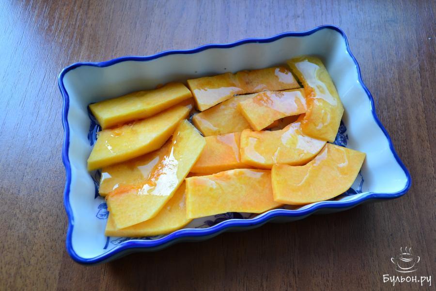 1. Мякоть тыквы порезать тонкими длинными кусочками, выложить их в порционную керамическую форму, пригодную для запекания. Сверху полить тыкву растительным маслом.