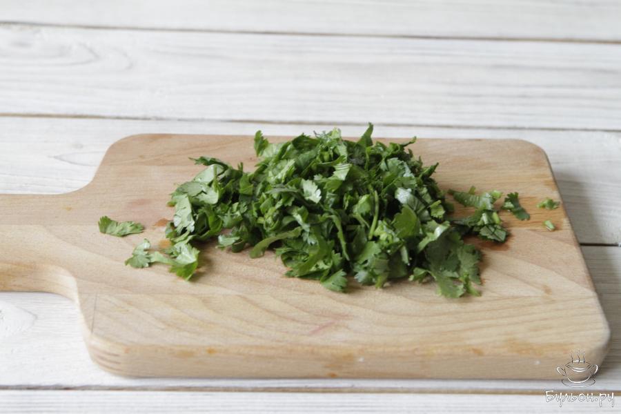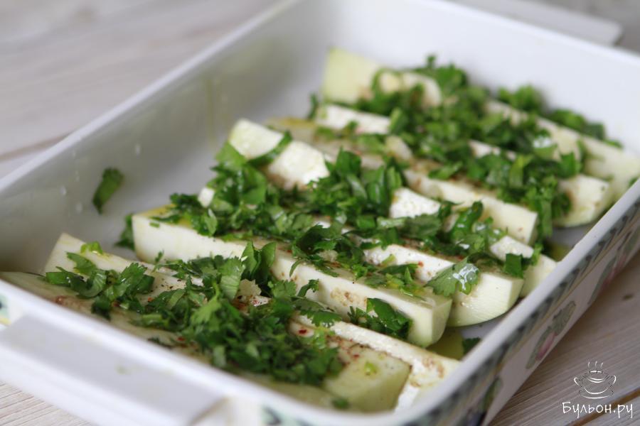 6. Сверху выложить чеснок, кинзу и обильно полить оливковым маслом. Отправить в заранее разогретую духовку. Запекать 35-40 минут при 180 гр. В процессе запекания, пару раз полить баклажаны маслом, собрав его со дна формы.