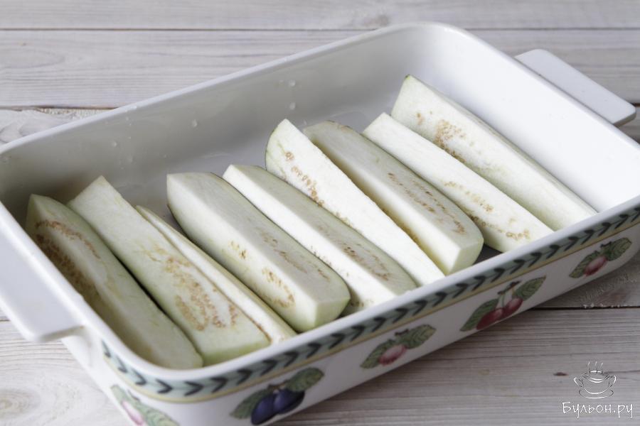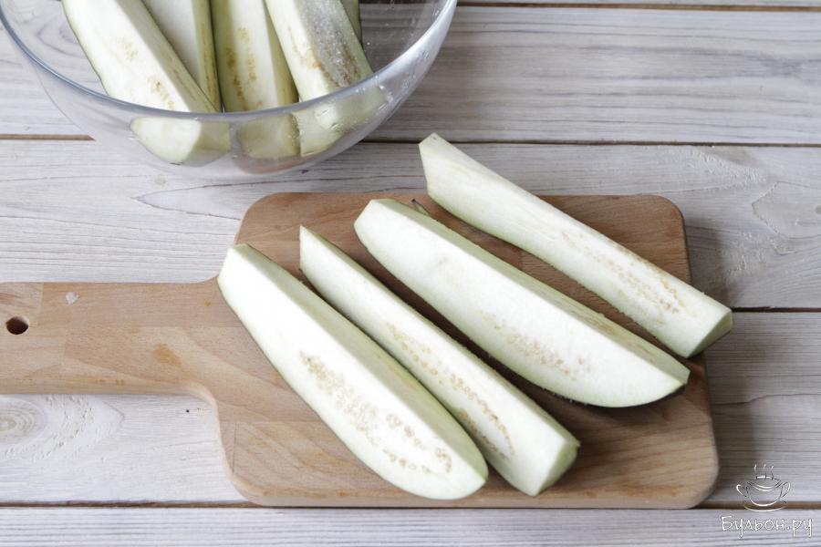 1. Баклажаны помыть, обсушить, срезать с них попки. Разрезать пополам и каждую часть еще раз пополам. Уложить их в чашу с водой, посолить и оставить в сторону на 10-15 минут. Это позволит избавиться от горечи.