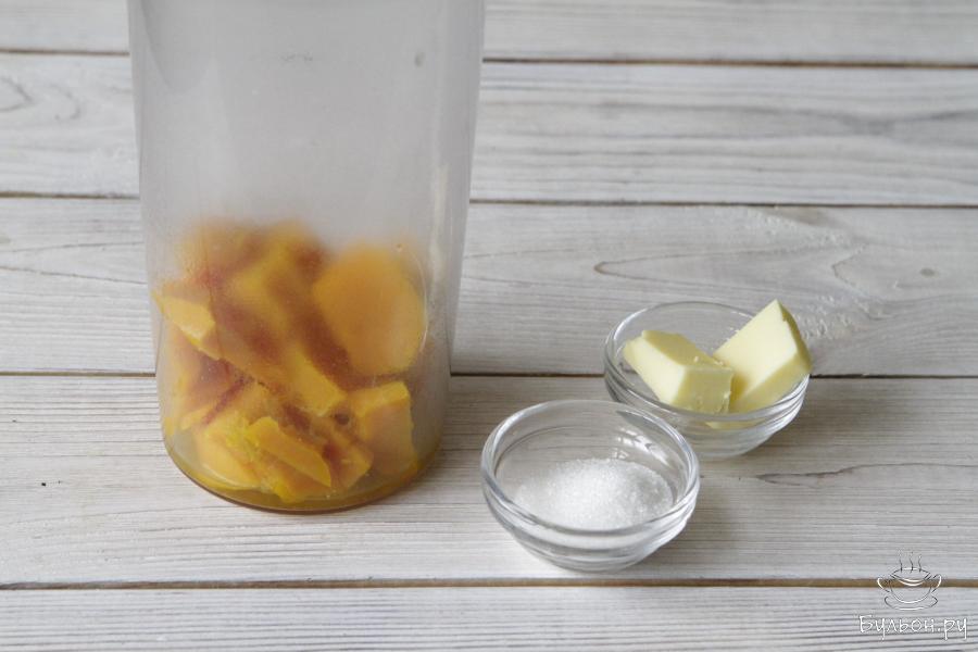 2. Готовые кусочки тыквы переложить в чашу блендера или стакан, добавить сахар, сливочное масло и перюривать.