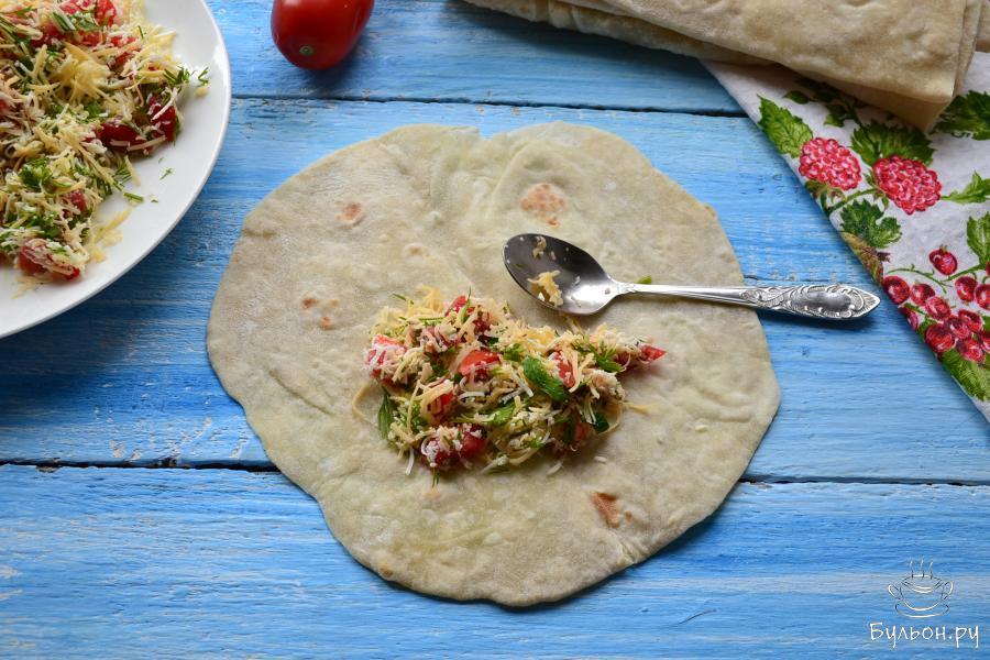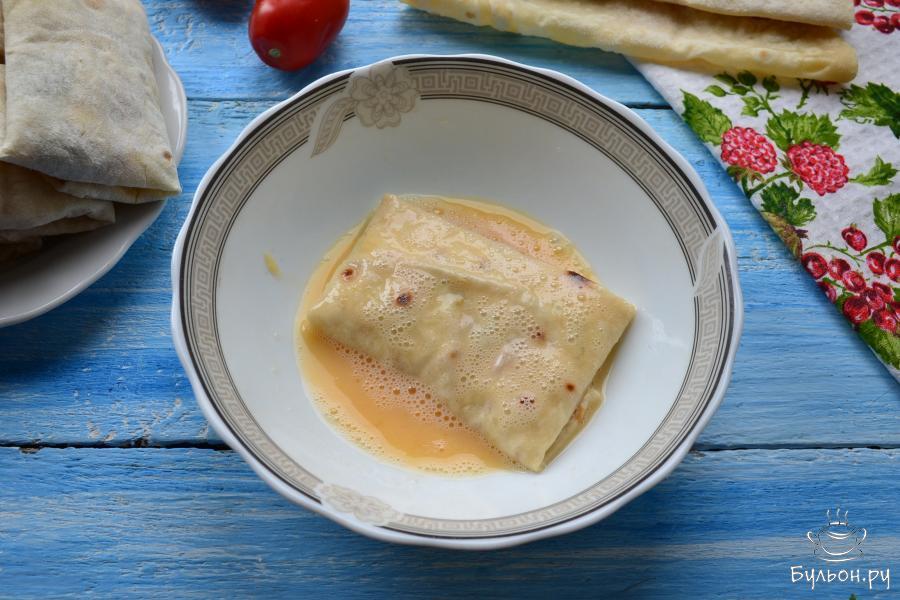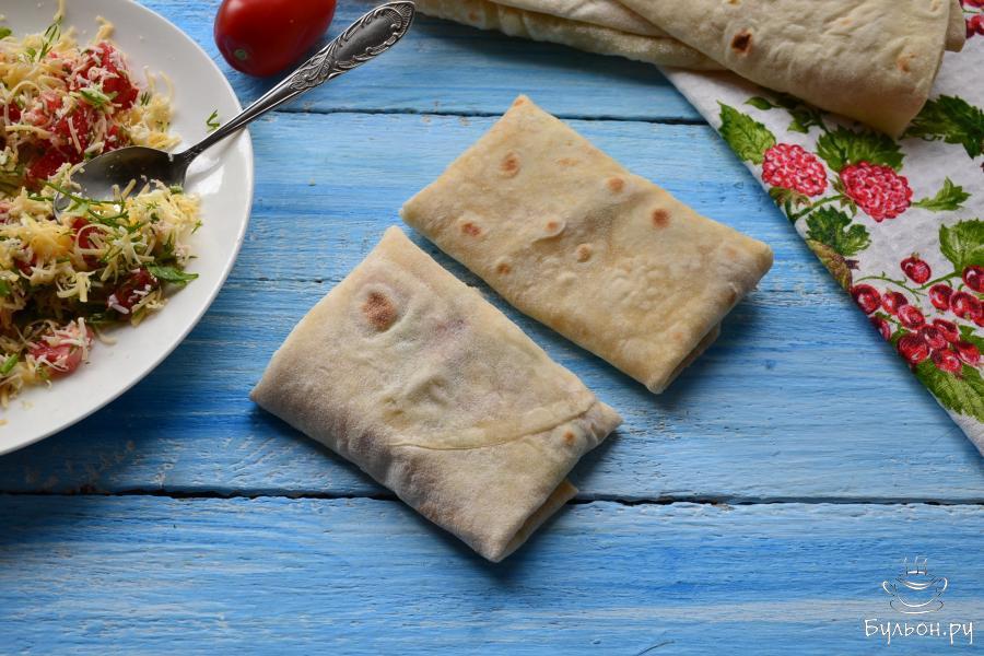 9. Выкладывать лаваш с начинкой в горячую сковороду, в которую влить достаточно масла растительного. Обжаривать конвертики с сыром и помидорами до хрустящего, румяного состояния с одной, а затем - другой стороны.