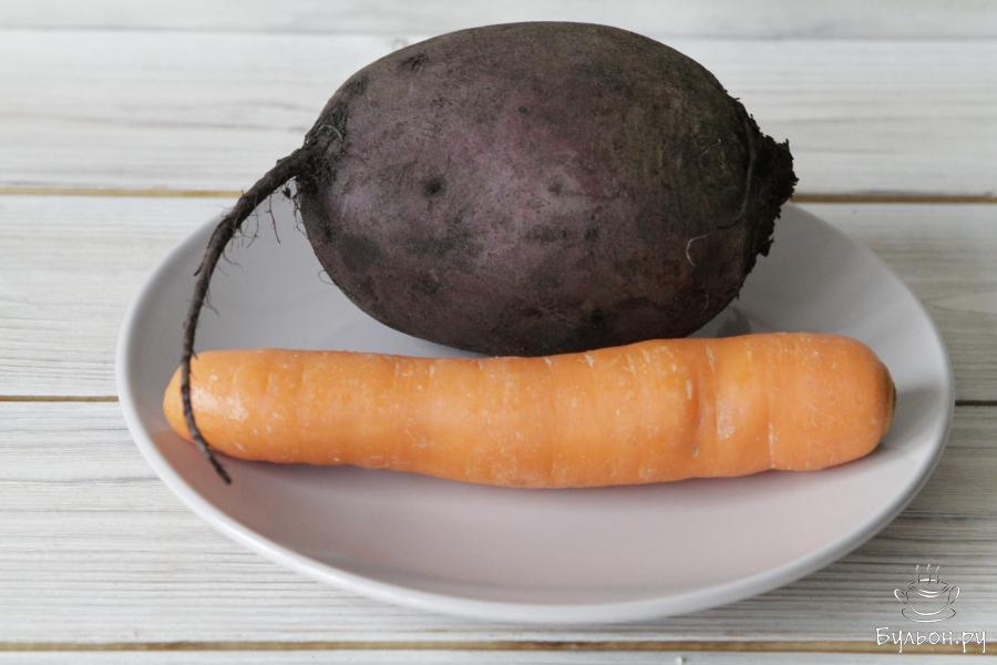 1. Количество овощей регулируйте самостоятельно. Свеклу и морковь промыть и отварить по отдельности до готовности.