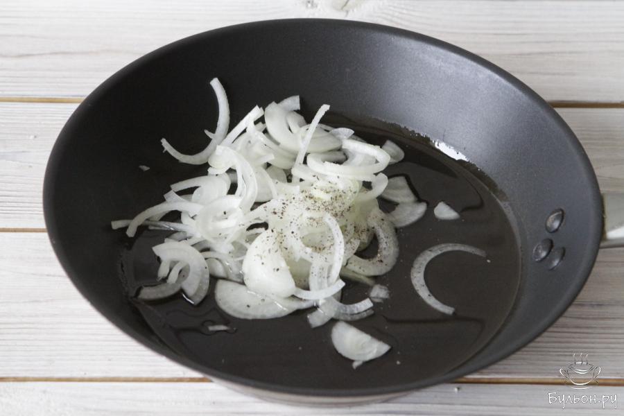 6. Растительное масло нагреть и обжарить на нем репчатый лук с черным перцем. Это придаст салату оригинальность и свою изюминку.