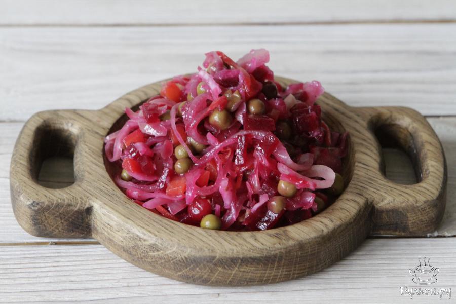 Начиная с осени и до глубокой весны многие хозяйки готовят неприхотливый, но очень вкусный, на мой взгляд, салат Винегрет. По традиции Винегрет относится к русской кухне и тонкостей приготовления, как и рецептов у салата много. Так к примеру Винегрет по этому рецепту готовится с квашеной капустой без добавления картофеля и соленых огурцов, а заправляется салат луком, предварительно обжаренным на растительном масле. Морковь и свеклу лучше отварить по отдельности. Перед тем как подать салат, он обязательно должен немного настояться, и пропитаться маслом.