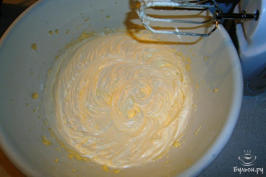 7. Тем временем взбиваем сливочное масло в течение 12 минут, потом взбиваем масло еще 10 минут, вливая остывшую массу из сгущенки и воды.