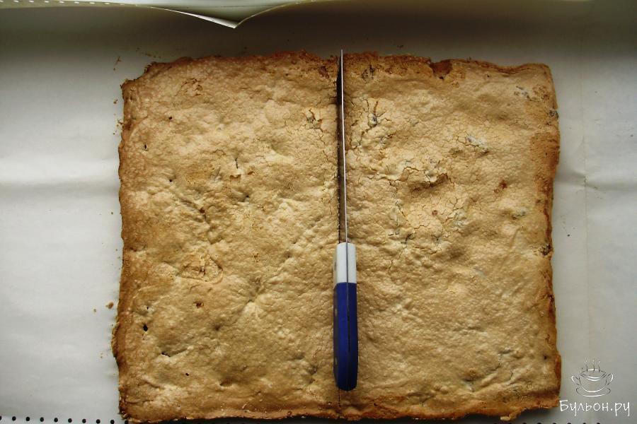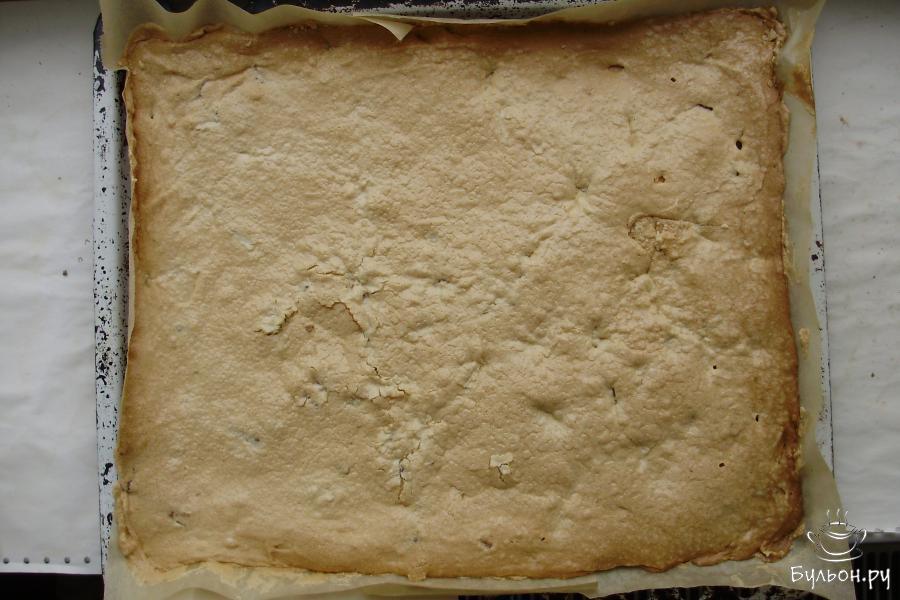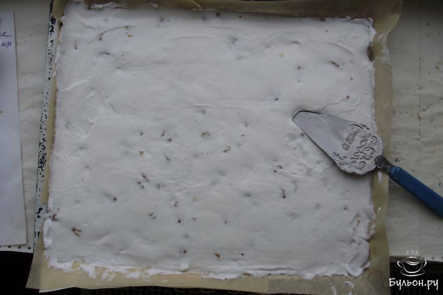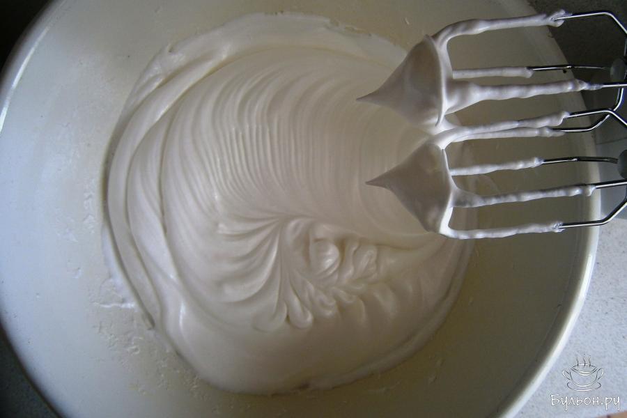 2. Затем разбиваем 10 куриных яиц, отделяя белки от желтков. Охлажденные белки взбиваем миксером на максимальных оборотах, понемногу засыпаем сахар в процессе взбивания. Взбивать нужно около 15 минут до густой пены. Добавляем жареные орехи и муку, перемешиваем силиконовой лопаткой.