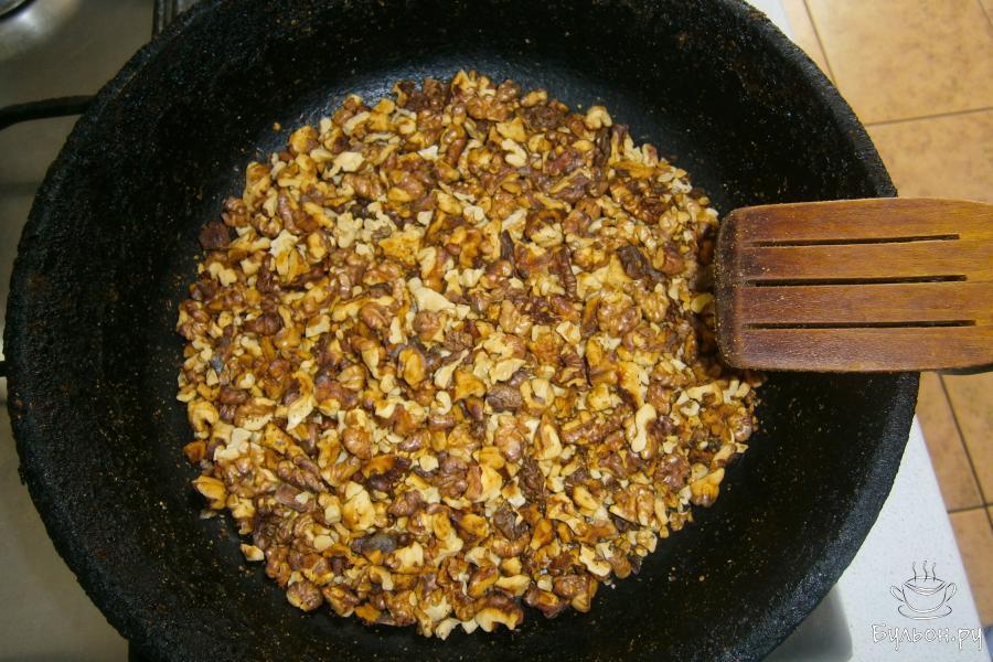 1. Для начала необходимо обжарить уже очищенные грецкие орехи на сковороде. Жарим на среднем огне до слегка коричневого цвета, мешая.