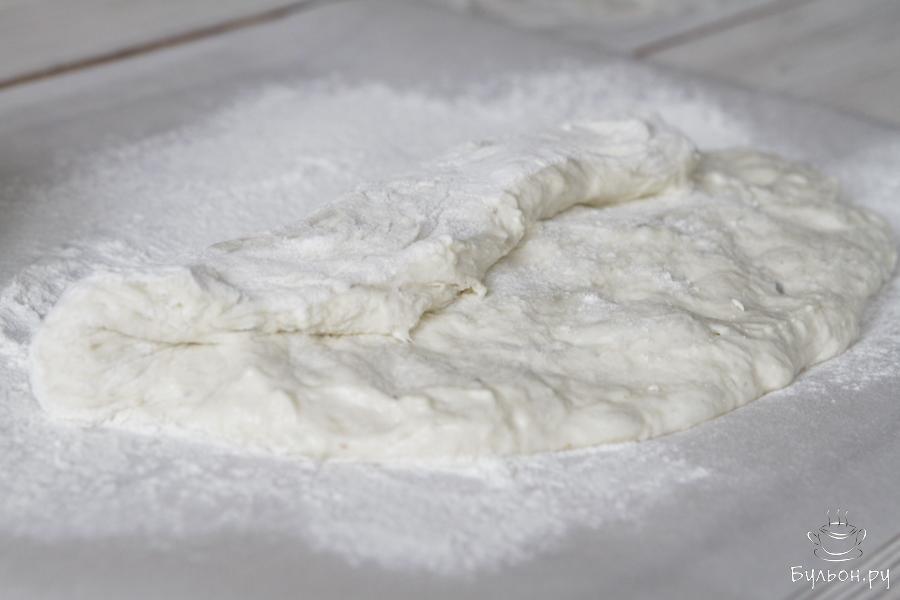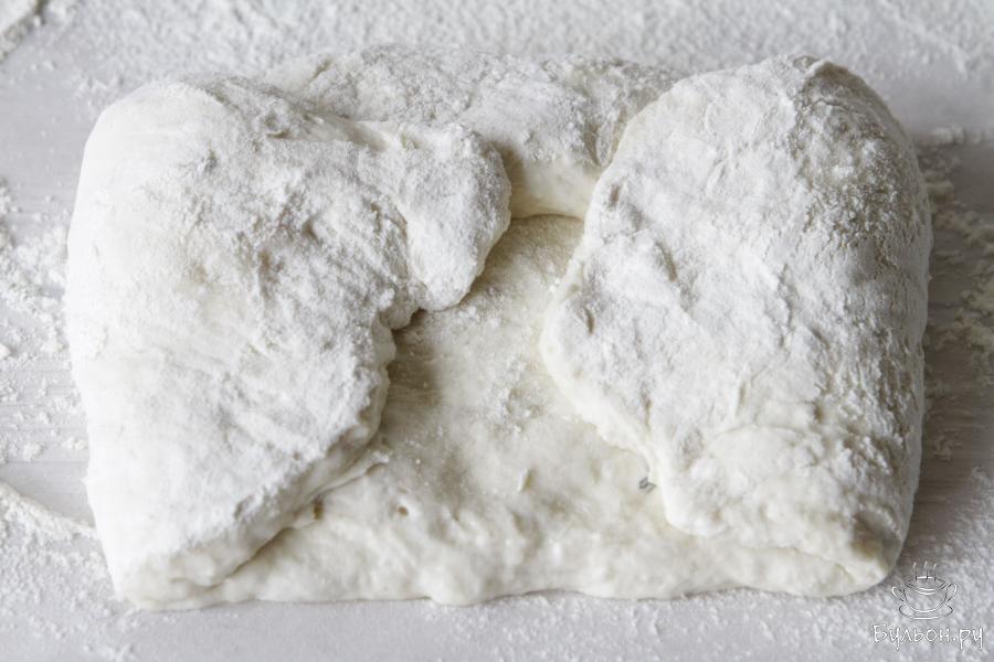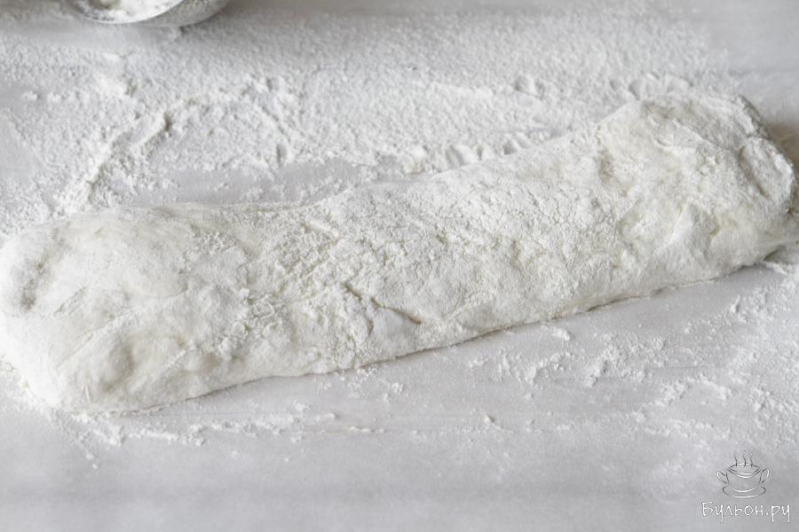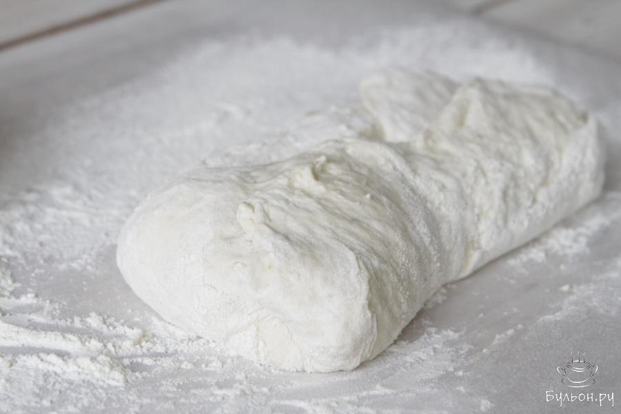 5. Работать с тестом нужно очень аккуратно и лишний раз его не мять. Слегка растянуть тесто на поверхности, образовав прямоугольник. Обратите внимание, как ведет себя тесто, на его поверхности пузыри.
