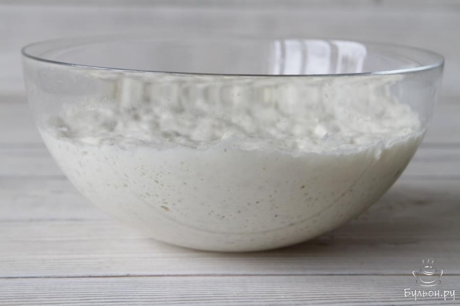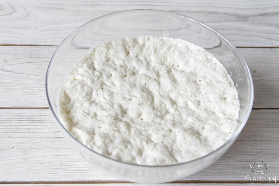 1. В чашу просеять муку, добавить прохладную воду, соль, дрожжи, прованские травы и семена с одной веточки тимьяна. Все ингредиенты просто перемешать между собой. Чашу с тестом накрыть пищевой пленкой и оставить на столе на 10-12 часов.