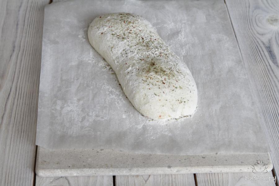 10. Заранее разогреваем духовку и камень для выпечки не менее 30 минут при 230 градусах. Далее аккуратно перекладываем чиабатту на камень, присыпаем еще слегка травами и семенами другой веточки тимьяна.